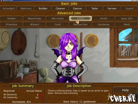 С началом игры начнётся и ваша жизнь в волшебном мире, вы сможете выбрать из 20 вариантов вакансий, каждая работа повышает определённые характеристики и открывается карьерный рост. Случайные события и судьбоносные встречи, завоюйте сердце избранника!