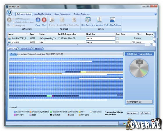 Данные в этой таблице отображаются в виде разноцветных квадратиков, расшифровку цвета которых можно посмотреть в главном окне PerfectDisk. Стоит отметить довольно быструю работу утилиты. Это связано с тем, что используется однопроходный метод дефрагментации с учётом S.M.A.R.T. данных винчестера. Может дефрагментировать не только локальные диски, но и с сетевые, причем в этом случае для облегчения настройки заданий используются профили сетевого планирования дефрагментации и полностью настраиваемое протоколирование работы. Поддерживаются работа с RAID-томами.