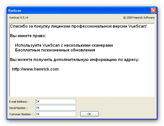 VueScan - программа для работы со сканерами HP, Minolta, Nikon, Polaroid, Epson, Canon и другими. Может работать с внутренней глубиной цвета. VueScan поддерживает автоматическую и ручную настройку большинства параметров и пакетный режим сканирования. Поддерживается более 500 моделей сканеров с определенным перевесом в сторону слайд-сканеров — Nikon, Minolta, Polaroid, Microtek, Epson. Предусмотрено автоматическое удаление дефектов изображения за счет канала инфракрасного сканирования и многопроходное сканирование с последующим усреднением результата — для подавления собственных шумов сканера. Имеются фильтры подавления зерна, нерезкого маскирования и удаления паразитного оттенка оригинала. Есть средства ручной корректировки динамического диапазона и градационной характеристики (независимо по каналам R, G, B).