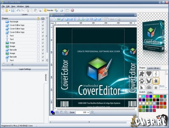 TBS Cover Editor - многофункциональная программа для создания и редактирования обложек и 3D коробок для ваших продуктов. Отличительной особенностью этой программы является возможность представления коробки во время редактирования в качестве развёртки её всех сторон одновременно с отображением её готового трехмерного вида, мгновенно меняющегося согласно сделанным изменениям в обложке коробки. Каждый объект на обложке создается в качестве отдельного слоя и вы даже сможете применять к нему различные эффекты, такие как внешняя и внутренняя подсветка, наложение тени от объекта, градиенты и т.д. Ещё одно не мало важное достоинство редактора - это базово заложенный богатый набор шаблонов вида коробок. Помощник программы после выбора вами понравившегося шаблона и ввода имени продукта и фирмы, пошагово доведет вас до конечного результата. В отличие от других аналогичных программ, рендеринг результата проходит очень быстро и вы сможете сохранить результат в один из графических форматов.