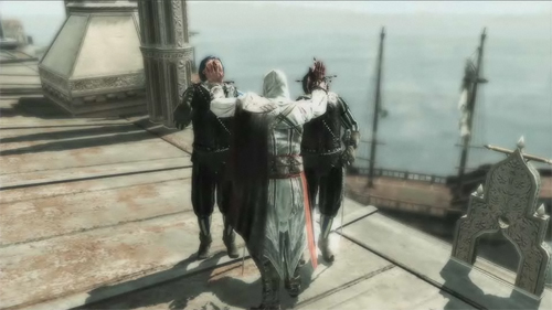 Во время «наземной» части демонстрации ахнуть публику заставило использование нового приема: киллер эпохи Возрождения разом умертвил двоих стоящих рядом противников при помощи кинжалов на обеих руках. Далее разработчики похвастались более бдительным ИИ: услышав характерный звук ассасина, рухнувшего в телегу с соломой, стражник решил проверить подозрительный объект. Впрочем, планам проткнуть стог алебардой не суждено было сбыться – внезапно высунувшийся Эцио нанес удар первым.