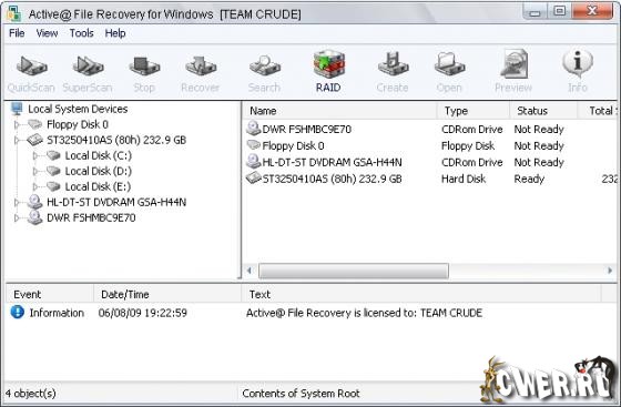 Active@ File Recovery - легкий в использовании, безопасный и эффективный инструмент для восстановления потерянных файлов. Программа обеспечивает восстановление данных в результате случайного удаления, повреждения, вирусной атаки или форматирования. Поддерживает работу с файловыми системами FAT12, FAT16, FAT32, NTFS, NTFS5 и NTFS+EFS. Программа позволяет восстанавливать большое количество файловых расширений, включая графические файлы, документы, архивы, презентации PowerPoint, файлы Corel Draw и многие другие. Кроме того, программа поддерживает большинство типов переносных/портативных устройств, включая CompactFlash, SmartMedia, Secure Digital/MultiMediaCard, карты памяти Sony, Iomega ZIP и т.д. File Recovery позволяет проделывать быстрое и расширенное сканирование дисков. Программа умеет работать напрямую с жестким диском, может создавать образы дисков для переноса данных на другие HDD или резервного копирования. Также имеется поддержка RAID массивов и томов.