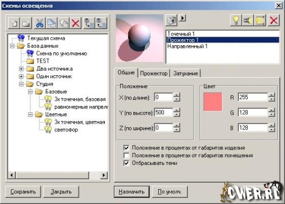 - Назначение и редактирование цвета и интенсивности любого источника света.