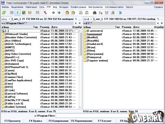 Total Commander - популярный файловый менеджер с практически всеми необходимыми для таких программ функциями. Кроме всех функциональностей, характерных для файловых менеджеров, в Total Commander встроены очень удобные просмотрщики для мультимедиа и графических файлов, распаковщики ZIP, ARJ, LZH, RAR, UC2, TAR, GZ, CAB, ACE и дополнительные dll для других архивных файлов; встроенный ftp-клиент - вообще просто прелесть: можно скачивать/закачивать файлы в несколько потоков, есть докачка, поддержка www-прокси при работе с ftp и есть даже такая функция, как подключение-скачивание-отключение в заданное время к заданному ftp. Не будут лишними и такие функции, как UUE/MIME/XXE кодирование/декодирование и разрезка/склейка длинных файлов, а также множество других функций, крайне необходимых для работы с файлами.