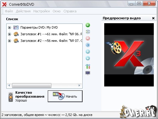 ConvertXtoDVD - программа, предназначенная для преобразования видео в формат, совместимый с DVD Video, и последующей записи содержимого на DVD. Программа поддерживает видео файлы AVI, Mpeg, Mpeg4, DivX, Xvid, MOV, WMV, WMV HD, DV, MKV, DVD, а также потоковое видео. Для работы программы не нужны внешние AVI-кодеки, поскольку она использует собственные. ConvertXtoDVD может автоматически создавать фрагменты (chapters), поддерживает наличие нескольких аудиодорожек, работает с субтитрами (.SRT .SUB/IDX .SSA). Также программа поддерживает создание несложного меню для DVD, в котором можно установить фон, выбрать цвет и другие параметры шрифта для надписей. Программа имеет русский интерфейс.