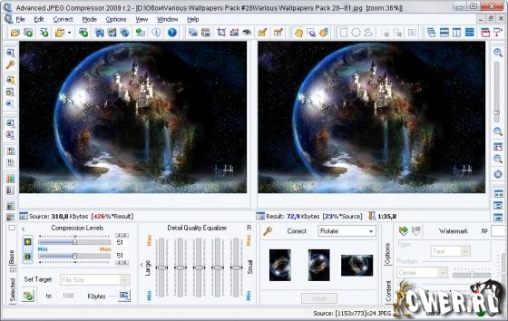 Advanced JPEG Compressor - одна из самых функциональных программ для сжатия изображений в формате JPEG. Возможно сжатие до 50% без потери качества. Программа обладает практически всем, что может только пожелать пользователь от программы для сжатия изображений. Главной особенностью программы является возможность просмотра сжатого изображения в режиме реального времени, т.е. вы увеличиваете или уменьшаете уровень компрессии, и картинка тут же изменяется. Таким образом, вы можете сразу увидеть результат...