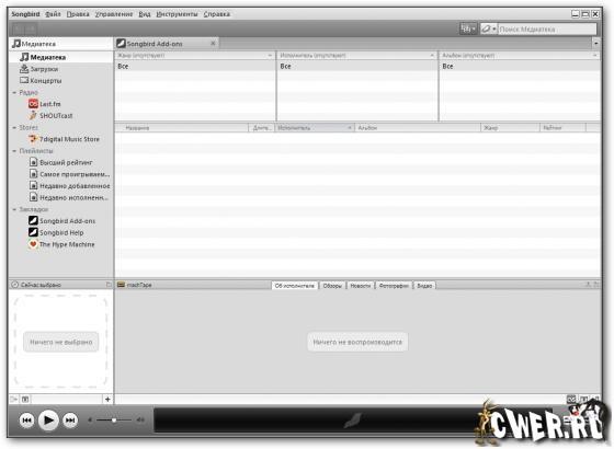 Songbird - aудиоплеер, основанный на движке популярного браузера Firefox. Ориентирован на воспроизведение музыкальных файлов не только с жесткого диска, но и из сети. По замыслу разработчиков, Songbird - это не столько аудиоплеер, сколько музыкальный веб-браузер... Songbird умеет работать с разнообразными форматами музыкальных файлов и музыкальными сервисами. Имеется возможность создания мультимедийной библиотеки, которая поможет организовать все музыкальные файлы компьютера в единый архив, при этом в нее можно включать и композиции, находящиеся в активных сетевых плейлистах.