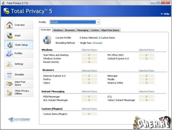 Total Privacy - специалист по уничтожению следов деятельности пользователя на компьютере. Приложение справляется с кэшем всех популярных браузеров и может подчищать историю интернет-пейджеров MSN Messenger, AOL, ICQ и Yahoo. Вдобавок программе по силам изменить историю посещенных страниц и недавно открывавшихся документов, а также многие менее существенные и не связанные с интернет-активностью "следы". Отметим еще возможность запуска программы по расписанию или по "условному сигналу" - к примеру, по закрытию браузера.