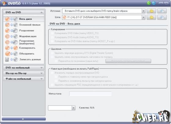 - 8 режимов копирования DVD на DVD:полный диск,основной фильм,разделение,переделывание,разделение по своему определению,клон,объединение и писать данные