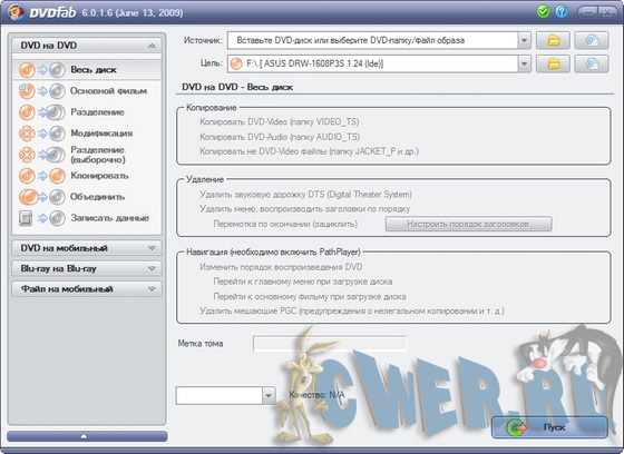 - Копировать на чистый DVD диск любого формата(DVD+R/RW, DVD-R/RW, DVD+R DL, DVD-R DL).