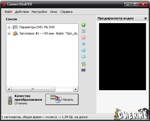 ConvertXtoDVD - программа, предназначенная для преобразования видео в формат, совместимый с DVD Video, и последующей записи содержимого на DVD. Программа поддерживает видео файлы AVI, Mpeg, Mpeg4, DivX, Xvid, MOV, WMV, WMV HD, DV, MKV, DVD, а также потоковое видео. Для работы программы не нужны внешние AVI-кодеки, поскольку она использует собственные. ConvertXtoDVD может автоматически создавать фрагменты (chapters), поддерживает наличие нескольких аудиодорожек, работает с субтитрами (.SRT .SUB/IDX .SSA). Также программа поддерживает создание несложного меню для DVD, в котором можно установить фон, выбрать цвет и другие параметры шрифта для надписей. Программа имеет русский интерфейс.