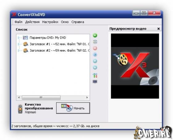 ConvertXtoDVD - программа, предназначенная для преобразования видео в формат, совместимый с DVD Video, и последующей записи содержимого на DVD. Программа поддерживает видео файлы AVI, Mpeg, Mpeg4, DivX, Xvid, MOV, WMV, WMV HD, DV, MKV, DVD, а также потоковое видео. Для работы программы не нужны внешние AVI-кодеки, поскольку она использует собственные. ConvertXtoDVD может автоматически создавать фрагменты (chapters), поддерживает наличие нескольких аудиодорожек, работает с субтитрами (.SRT .SUB/IDX .SSA). Также программа поддерживает создание несложного меню для DVD, в котором можно установить фон, выбрать цвет и другие параметры шрифта для надписей. Программа имеет русский интерфейс.