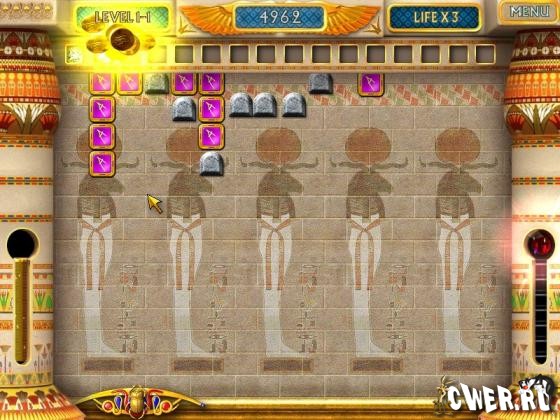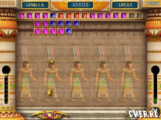 В этой игре вам предстоит отправиться на поиски несметных сокровищ фараона Ахенатена. Чтобы справиться с этой задачей, вам необходимо при помощи жуков-скарабеев очистить игровое поле от разноцветных блоков и доказать, что вы — достойный наследник великого царя.