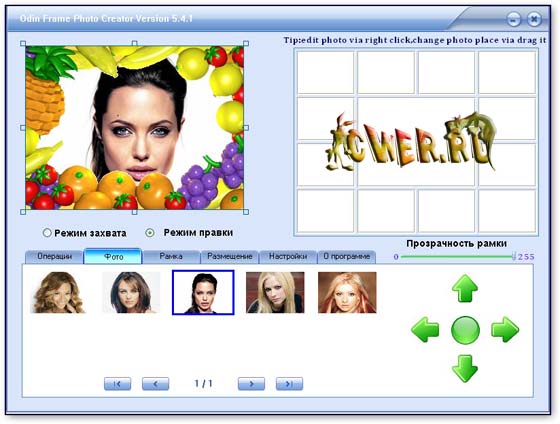 С помощью Frame Photo Editor вы сможете "вдохнуть в ваши фотографии новую жизнь ", то есть придать гармоничный и законченный вид . Используя незамысловатые инструменты, легко можно добавить текст, наложить поверх другие изображения, повернуть под углом фотографию, изменить размер. Кроме этого, фотография непременно преобразится, если подобрать к ней удачную рамку, или подставить фоновый задний план. Можно также использовать разнообразные Photo Mask, придающие изображению оригинальные очертания, можно добавлять элементы мультипликации (CLIP) и т. д . Результат вашей творческой работы можно не только просто сохранить, а тут же отправить по почте друзьям, распечатать на принтере, или установить в виде обоев.