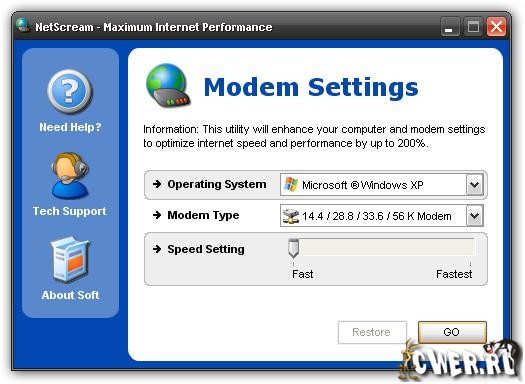 NetScream - программа, которая поможет вам увеличить скорость интернет-соединения до максимально допустимой. NetScream способна добиться полной отдачи от модема путем тонкой настройки его программных параметров. Программа имеет интуитивно понятный интерфейс, оптимизирует настройки для Dial-up, DSL, ADSL, ISDN, спутниковых и кабельных модемов, предотвращает разрывы соединения и повышает скорость скачивания/закачивания файлов.