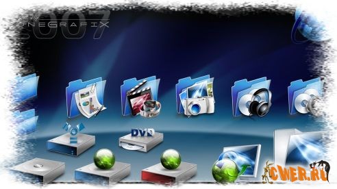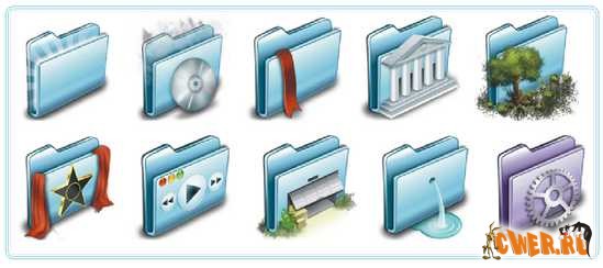 Красивые иконки для папок различного назначения. Очень хорошо сочетаются с визуальными стилями для Windows чёрного цвета.