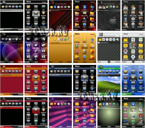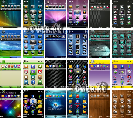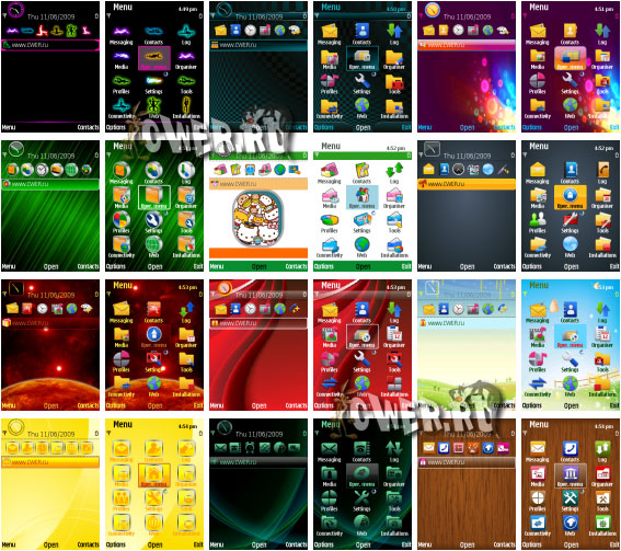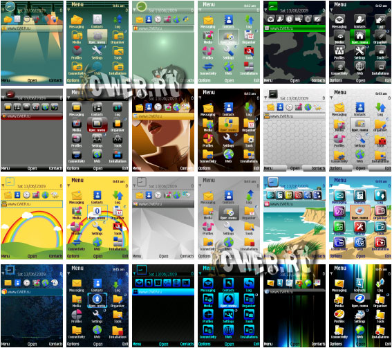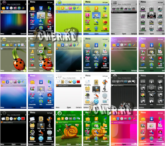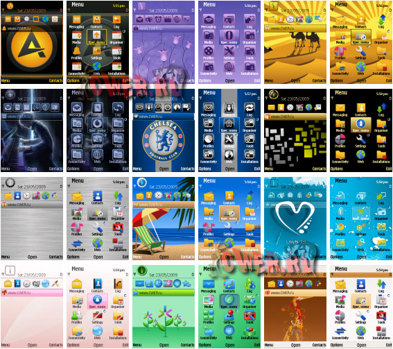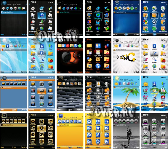Темы для смартфонов Nokia под управлением Symbian OS 9.х: Nokia 3250, 5500 Sport, 5700, 6110 Navigator, 6120 c, 6121, 6220 classic, 6290, E50, E51, E60, E61, E61i, E62, E65, E70, E90, N71, N73, N75, N76, N77, N78, N79, N80, N81, N81 8GB, N82, N91, N92, N93, N93i, N95, N95 8GB и др.