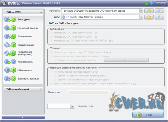 Мощный, многофункциональный программный продукт для копирования DVD дисков с возможностями гибкой обработки видеопотока. Программа является одной из лучших на сегодняшний день, из инструментов для копирования, разбиения, пережатия и конвертирования DVD дисков с фильмами. Снимает все защиты и ограничения с диска и при желании пережмет диск большой емкости и вместит его в обыкновенную пустую DVD болванку с минимальными потерями качества (DVD9->DVD5) или разобъет фильм на два диска с полным переносом его меню, удалит всю рекламу, запишет только фильм и многое другое. Программа имеет интуитивно понятный, мультиязычный интерфейс включая русский.