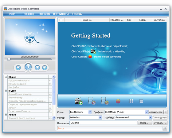Joboshare Video Converter - простая и стабильная программа для быстрой конвертации видео и аудио форматов. Поддерживает практически все популярные видео и аудио форматы, такие как AVI, MPEG, WMV, DivX, MP4, H.264/MPEG-4 AVC, RM, MOV, XviD, 3GP, FLV, VOB (видео формат, используемый в DVD), DAT (видео в формате VCD, SVCD), MP2, MP3, WMA, WAV, RA, M4A, AAC, AC3, OGG и т.д. Поддерживает форматы мобильных устройств iPod, iPhone, Apple TV, Zune, PSP, Pocket PC, Creative Zen, Archos и так далее.