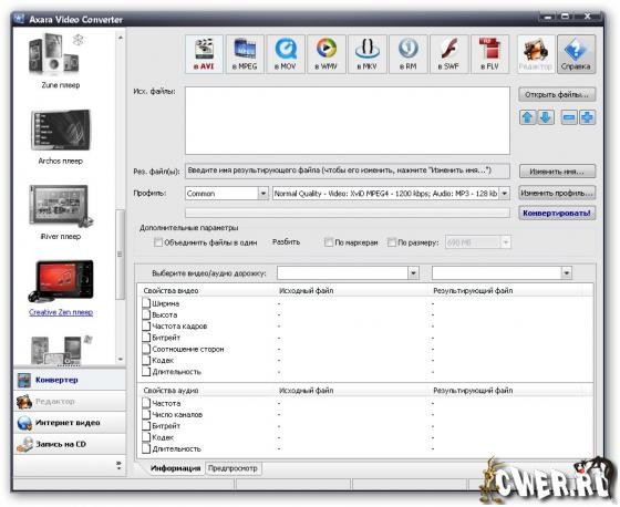 Axara Video Converter - комплексная программа специально созданная для работы с видеофайлами. Конвертирует в любой существующий формат. Кроме стандартных возможностей конвертации, работает с Sony PSP, iPod, Creative, Microsoft Zune и т.д. Имеется возможность закачки с YouTube, Google, YAHOO!, MySpace, AOL, CollegeHumor, metacafe и закачки непосредственно в iPod. И еще одна интересная возможность: благодаря новой технологии 2PassEncoding позволяет сконвертировать DVD-фильм в стандартный XviD MPEG4 без потери качества.