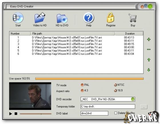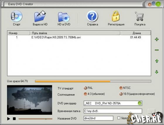 Easy DVD Creator - простой и удобный инструмент для конвертирования AVI/DIVX/XVID/DIV, MPEG/MPG/DAT, WMV/ASF/ASX, RM/RMVB, MOV/QT, 3GP/3G2, MP4/M4V, и FLV в DVD, которые вы сможете посмотреть на обычном домашнем DVD-плейере. С помощью Easy DVD Creator вы сможете превратить фильмы о ваших путешествиях, свадьбах, домашних торжествах в DVD, которые можно показать друзьям и семье! Просто добавьте видео-файлы в список файлов конвертера и нажмите кнопку “Start”