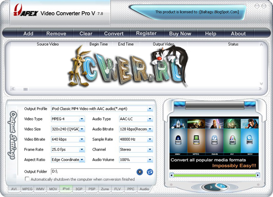 Профессиональный конвертер видео файлов из одного формата в другой. Apex Video Converter Pro поддерживает конвертацию форматов AVI, DivX, XviD, MPEG, WMV, MOV, ASF, QuickTime, RM, RMVB, DVD, SVCD, VCD, MPEG-1, MPEG-2 и других.