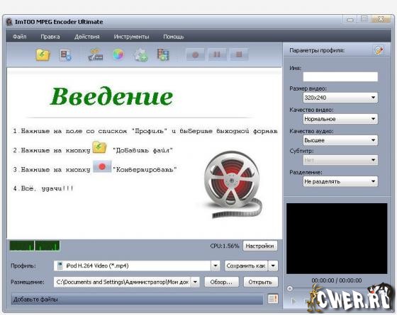 ImTOO MPEG Encoder - мощная утилита для конвертирования видео-файлов. Программа позволяет конвертировать файлы любых форматов, таких как AVI, MPEG, DivX, WMV, MP4, MOV, FLV, 3GP, PSP MPEG-4, iPod MPEG-4 и другие. Помимо этого программа может извлекать аудиодорожку из видео-файлов, конвертировать большинство популярных звуковых форматов, таких как MP3, WMA, WAV, AAC, M4A и другие.