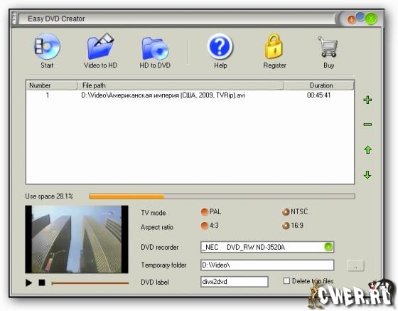 Easy DVD Creator - простой и удобный инструмент для конвертирования AVI/DIVX/XVID/DIV, MPEG/MPG/DAT, WMV/ASF/ASX, RM/RMVB, MOV/QT, 3GP/3G2, MP4/M4V, и FLV в DVD, которые вы сможете посмотреть на обычном домашнем DVD-плейере. С помощью Easy DVD Creator вы сможете превратить фильмы о ваших путешествиях, свадьбах, домашних торжествах в DVD, которые можно показать друзьям и семье! Просто добавьте видео-файлы в список файлов конвертера и нажмите кнопку “Start”