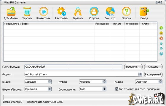 Ultra RM Converter - позволяет конвертировать, соединять фрагменты, разрезать (разбиение или/и вырезание) файлы RealMedia, RM, RMVB - поддерживается их преобразование в AVI, MPEG, VCD, SVCD, DVD, WMV, а также конвертация AVI, MPEG1, MPEG2, VCD, SVCD, DVD, WMV/ASF.