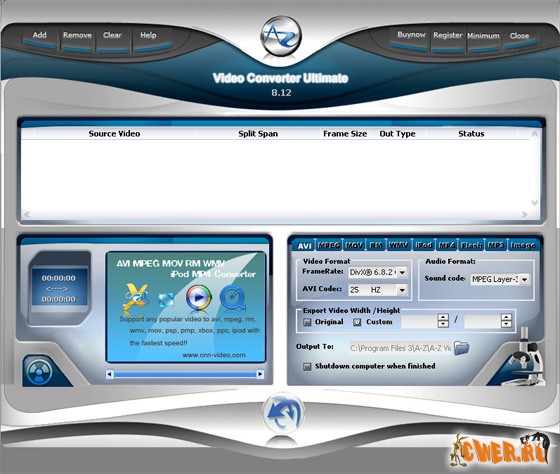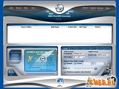 A-Z AVI MPEG MOV RM WMV iPod MP4 Converter это мощное и удобное в использовании приложение для конвертирования популярных видео файлов в AVI, MPEG, MOV, RM, WMV, iPod, 3GP, MP4, Xbox, Pocket PC с хорошим качеством. Простой в использовании пользовательский интерфейс и быстрая скорость конвертирования позволят вам с легкостью конвертировать множество форматов видео между собой. На сегодняшний день AVI MPEG MOV RM WMV iPod MP4 Converter самое мощное и недорогое средство для решения проблем по конвертированию видео на вашем компьютере.