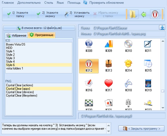 IconTo - программа предназначена для быстрого и удобного изменения вида значка папок и разделов диска на любые указанные вами (ICO, CUR, ICL или из ресурсов DLL, EXE и т.д.) в операционных системах семейства Windows. Для более быстрого доступа к избранным значкам в IconTo содержится небольшой список системных ресурсов Windows, в которых находятся значки, список, который, можно пополнять самостоятельно. Так же, в программе присутствуют встроенные значки, состоящие из разных стилей и подходящие под разные операционные системы, количество которых превышает 300 штук.