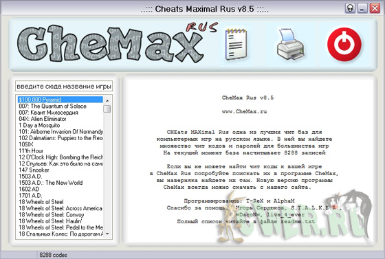 CheMax - большая база данных с кодами для игр. База CheMax является прямой наследницей базы программы ChEaTs, которая была существенно дополнена. Особенностю базы является отсутствие в ней хинтов и прочей “отсебятины” - в ней представлены только коды (cheats, hex-cheats) и пароли (passwords)...