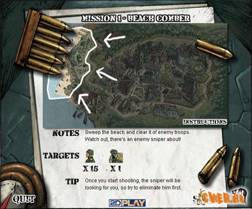 Неплохая флешка на тему Второй Мировой. Вы - снайпер. Ваша задача перестрелять всех фрицев, как куропаток! Будьте бдительны и осторожны - вражеские снайперы тоже не дремлют и к тому же, время против Вас. Готовы? Тогда винтовку в руки и вперёд...