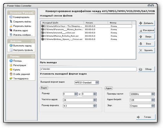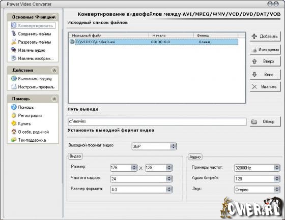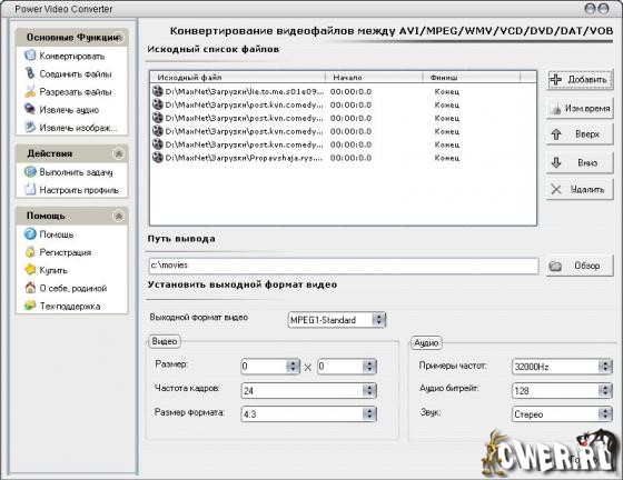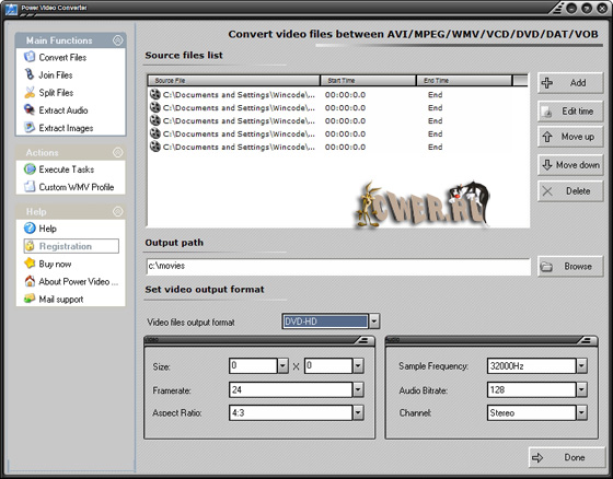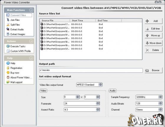 Утилита Power Video Converter предназначена для преобразования видеофайлов из одного формата в другой. Кроме этого, Power Video Converter позволяет производить резку и склейку файлов. Программа поддерживает форматы AVI, MPEG1, MPEG2, VCD, DVD, ASF и WMV.
