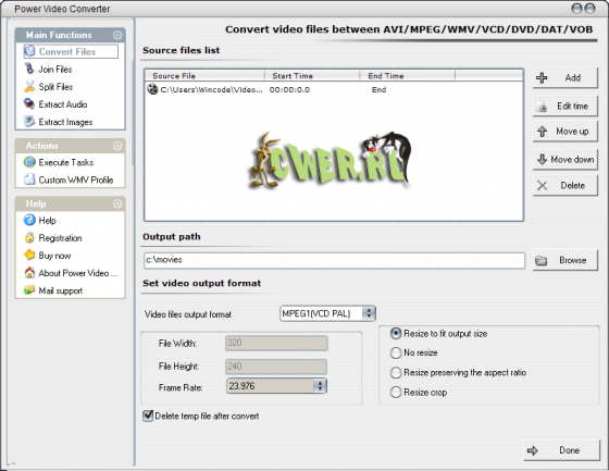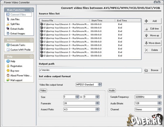 Power Video Converter - является конвертером между популярными видео форматами. Особенности: поддержка AVI, DivX, XviD, MPEG-4, MPEG1, MPEG2, VCD, SVCD, DVD, WMV, ASF, DAT, VOB форматов, пакетный режим конвертирования, высочайшая скорость конвертирования, поддержка PAL, NTSC видео, нарезка видео на фрагменты (ролики) по выбранному размеру или по временным позициям в встроенном проигрывателе, соединение фрагментов в один большой видео файл, извлечение аудио из видео и сохранение в mp3, wav, wma форматы, извлечение фрейма или разложение видео на последовательность bmp картинок, создание или загрузка wmv профиля, простой и удобный интерфейс, выбор и настройка кодеков, настройка параметров конвертирования, низкие системные и аппаратные требования.