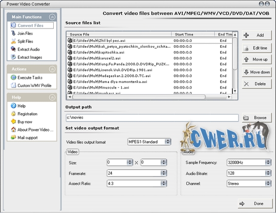 Утилита Power Video Converter предназначена для преобразования видеофайлов из одного формата в другой. Кроме этого, Power Video Converter позволяет производить резку и склейку файлов. Программа поддерживает форматы AVI, MPEG1, MPEG2, VCD, SVCD, DVD (PAL, NTSC), ASF и WMV. Среди особенностей программы - возможность пакетной обработки файлов, а также извлечение аудиотреков в форматы WAV, WMA и MP3.