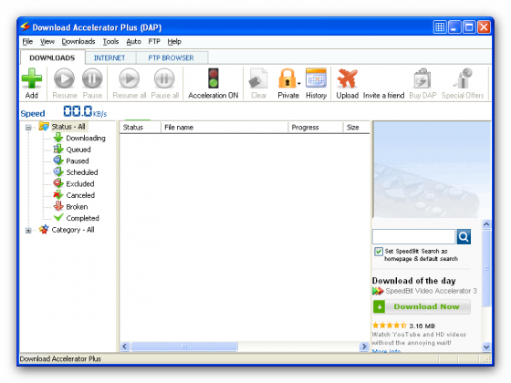 Download Accelerator Plus - менеджер закачек, позволяющей ускорить процесс скачивания файлов из интернета. Поддерживается одновременная загрузка с нескольких серверов, докачка после разрыва соединения, автовыключение компьютера после завершения сеанса работы. Утилита имеет встроенные средства поиска файлов на серверах. Download Accelerator Plus хорошо интегрируется с браузерами, поддерживает работу через прокси и т.д. Имеется русский интерфейс.