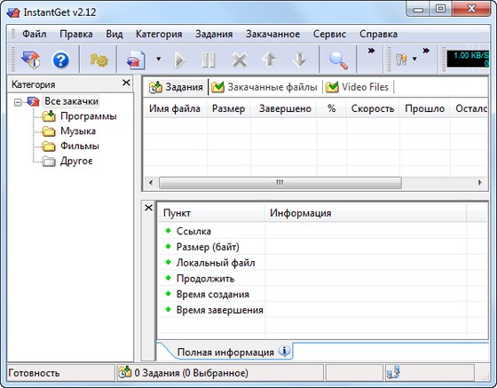 InstantGet — это небольшой, но мощный и удобный менеджер загрузок, позволяющий скачивать файлы по протоколам HTTP и FTP. Программа обладает приятным и удобным интерфейсом, поддерживает докачку, может скачать файлы несколькими потоками, позволяет ускорить загрузку, обладает большим количеством настроек, имеется встроенный поиск, интегрируется в оболочку, отслеживает появление ссылок в буфере обмена и т.д.