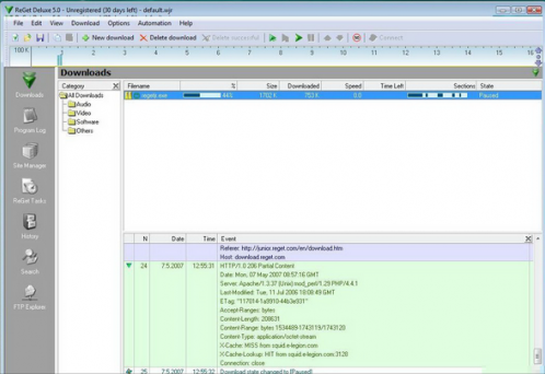 ReGet Deluxe - менеджер закачек для опытных пользователей. Он включает в себя широкий спектр возможностей для управления закачками: работа по расписанию, поиск файлов в Интернете (в том числе MP3), менеджер сайтов, история закачек, извлечение ссылок с веб-страниц и т.д.