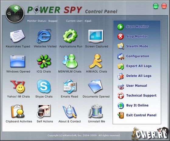 Вышла новая версия программы, предназначенной для слежения за тем, какие действия производятся на компьютере. Программу удобно использовать, чтобы узнать, чем заняты дети в отсутствие родителей, жена – когда мужа нет дома и т.д. Power Spy записывает нажатия клавиш, открываемые окна, все данные, которые копируются в буфер обмена, набранные пароли, запускаемые приложения, чаты Skype, MSN Messenger, Windows Live Messenger, ICQ, AIM, Yahoo! Messenger и Windows Messenger. Кроме этого, сохраняется информация обо всех сайтах, которые посещались при помощи браузеров Internet Explorer, Firefox, Netscape, Avant Browser, Maxthon, NetCaptor и SlimBrowser.