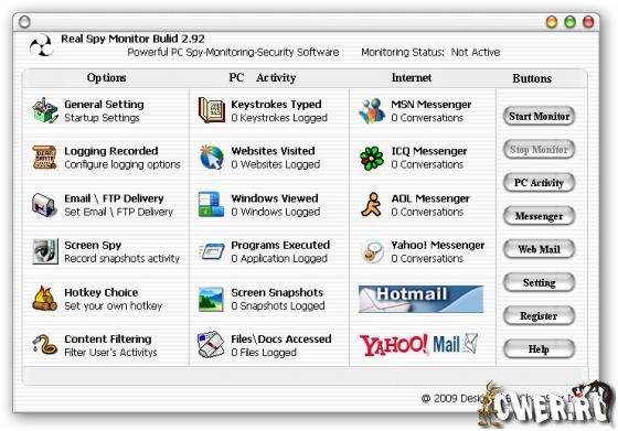 Real Spy Monitor - программа-шпион, записывает в лог-файл все действия пользователя за компьютером. Позволяет отслеживать: нажатые на клавиатуре клавиши, запускавшиеся программы и открывавшиеся документы, принятые и отправленные сообщения в Интернет-пейджерах AOL, ICQ, MSN, AIM, Yahoo Messenger, а также делает периодические снимки экрана.