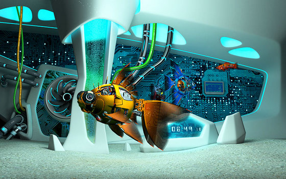 Превратите свой экран в трёхмерный аквариум в стиле sci-fi и созерцайте неторопливое плавание удивительных механических рыб среди причудливых форм будущего.