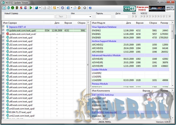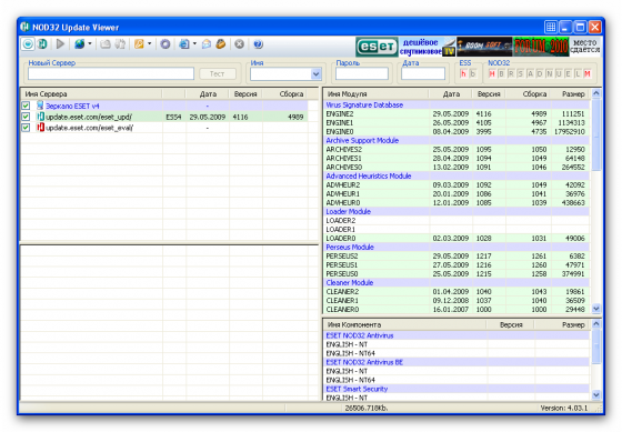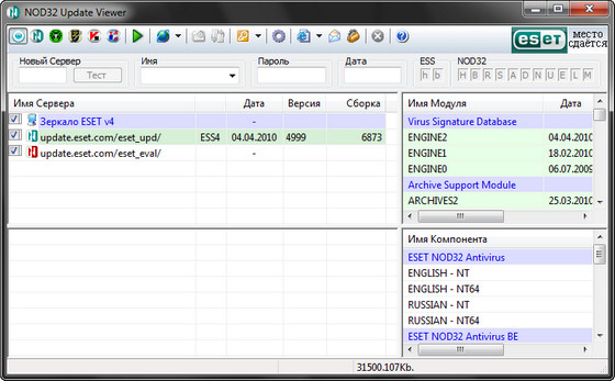 И вновь обновилась программа NOD32 Update Viewer предназначенная для загрузки обновлений с официальных и зеркальных серверов ESET, CureIt (DrWEB), AVZ, AVPTool, Trojan Remover с последующим формированием собственного зеркала обновлений локально, на своем компьютере. Расширяет функциональность и повышает надежность получения обновлений для антивируса ESET NOD32 EAV и ESS.