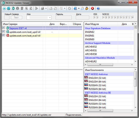 Программа NOD32 Update Viewer предназначена для загрузки обновлений с официальных и зеркальных серверов ESET, CureIt (DrWEB), AVZ, AVPTool, Trojan Remover с последующим формированием собственного зеркала обновлений локально, на своем компьютере. Расширяет функциональность и повышает надежность получения обновлений для антивируса ESET NOD32 EAV и ESS.