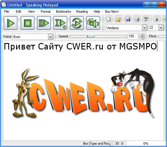 Speaking Notepad - говорящий текстовый редактор. Помимо функций присущих текстовому редактору, умеет проговаривать вводимый текст на разных языках, в том числе и на русском. Иногда нет возможности читать, но есть возможность слушать, удобный вариант слушать книги. Для того, чтобы он читал по-русски, выберите голос "Boris".
