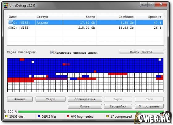 UltraDefrag оперативно выполняет дефрагментацию диска, поскольку процесс совершается в режиме ядра. Программа работает в трех интерфейсах: графическом, собственном и режиме консоли. В графическом интерфейсе файловая система компьютера представлена визуально в виде цветовых блоков.