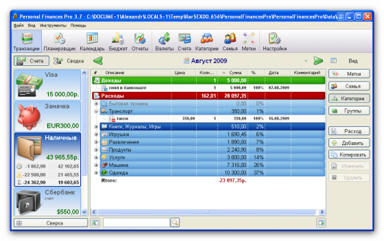 Программа Personal Finances Pro 3.7 предназначена для управления личными расходами и доходами. Она поможет вам контролировать свои финансы – понять, куда уходят деньги, выделить излишне "разбухшие" статьи расходов и заметно сократить ненужные траты. Отличительными особенностями программы являются красивый и продуманный интерфейс, простота использования и наглядность результатов. Программа Personal Finances требует минимум времени для ведения учета, достаточно проста для освоения новичками, а также предоставляет богатый функционал и множество настроек для искушенных пользователей.