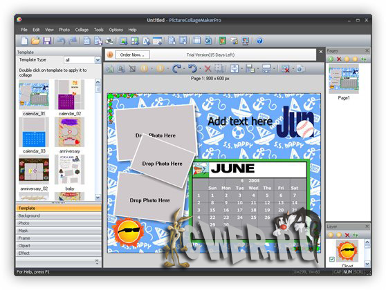 Picture Collage Maker - простая в использовании программа для создания коллажей из ваших фотографий. Простой интерфейс программы и множество шаблонов позволят легко создавать разнообразные фотоколлажи (календари, поздравительные открытки, пригласительные билеты, постеры и т.д.) даже неопытным пользователям. Создание коллажей - это расслабляющее время-провождение, помогающее превращать собранные фотографии в драгоценные воспоминания. Это самый легкий способ создания коллажей с применением вращений, изменения размеров, положений, обрамлений, маскировки, слияния и применением различных эффектов для каждой картинки по-отдельности. Результат может быть сохранен в форматах JPG, BMP, TIFF, GIF, WMF, TGA, PNG или установлен в качестве фонового рисунка для рабочего стола.