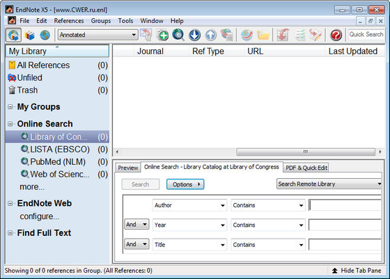EndNote - самая популярная программа для поиска в on-line библиографических ссылок и данных в различных базах данных библиотек и научных заведений мира, EndNote отличный инструмент в руках научного работника, инженера, изобретателя, библиографа, студента и просто увлеченного человека. Данная программа просто незаменима при написании научных работ и диссертаций а также при поиске библиографических данных книг, научных журналов и статей, EndNote позволяет вести поиск по самому широкому спектру представленных Вами данных. Имея данную программу и подключение к Интернету Вам больше не надо выискивать часами и днями названия книг или точные библиографические данные научной статьи в пыльных и каталогах библиотек.