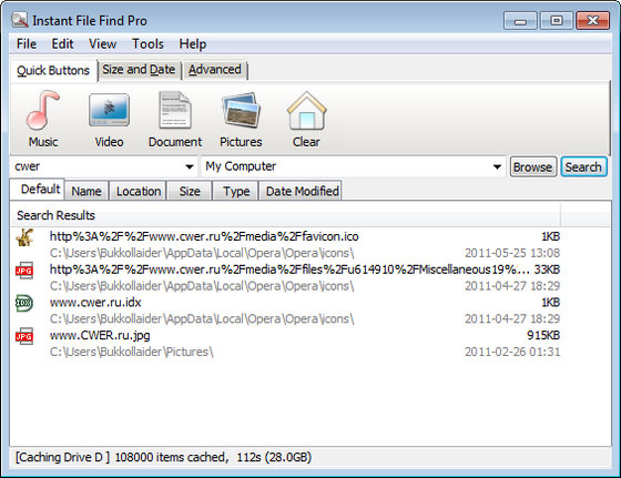 Instant File Find — очень полезный инструмент для быстрого поиска файлов в указанных разделах жесткого диска и директориях. С помощью кнопок в верхней панели окна программы вы сможете мгновенно отобразить все музыкальные, видео и графические файлы или документы, которые находятся на вашем компьютере или в выбранной директории. Также в этой панели можно создавать собственные кнопки для быстрого поиска нужных типов файлов. Поиск производится по имени или типу файлов (например: *.jpg;*.bmp). Для более тщательного поиска есть возможность указания в настройках минимального и максимального размера файлов, которые нужно найти.